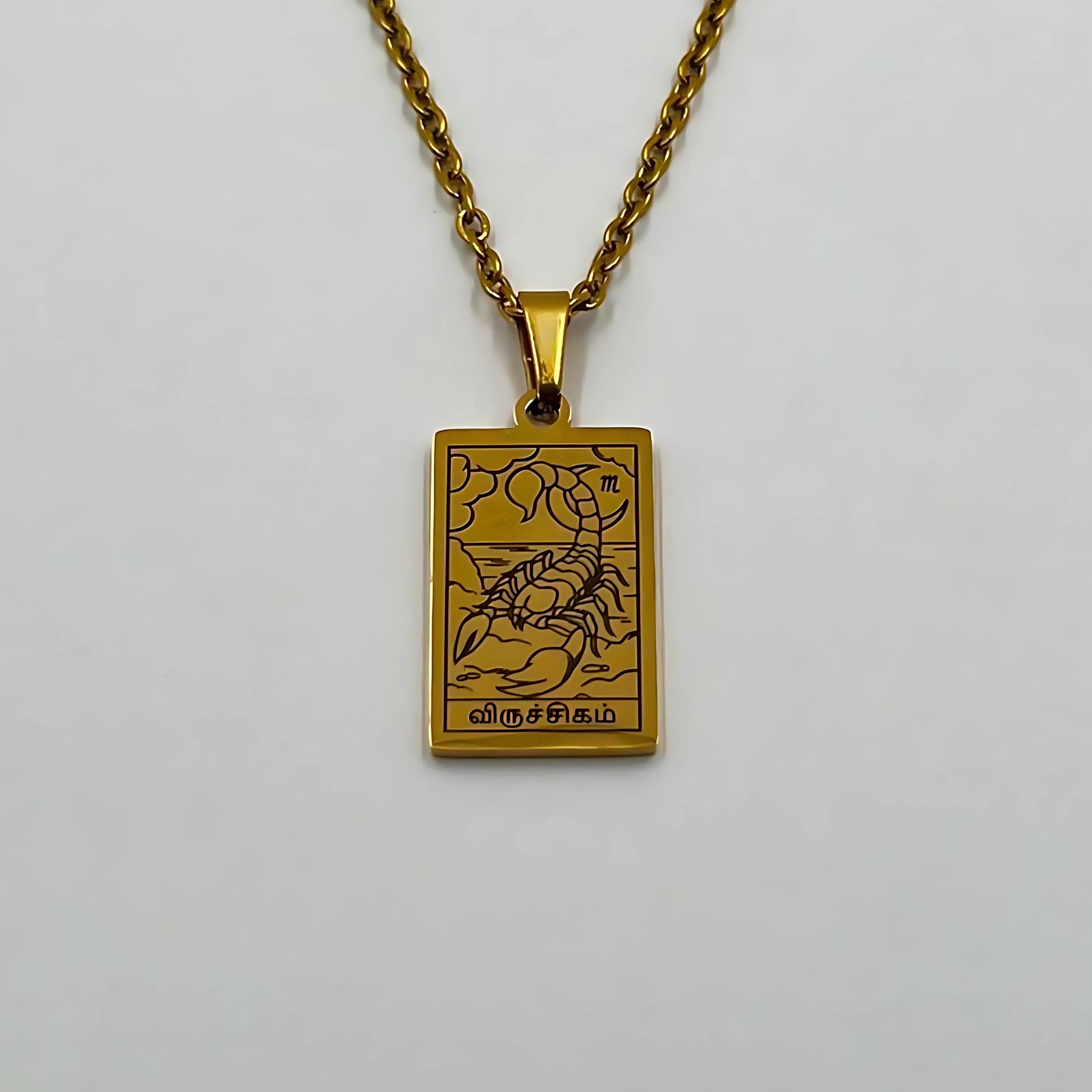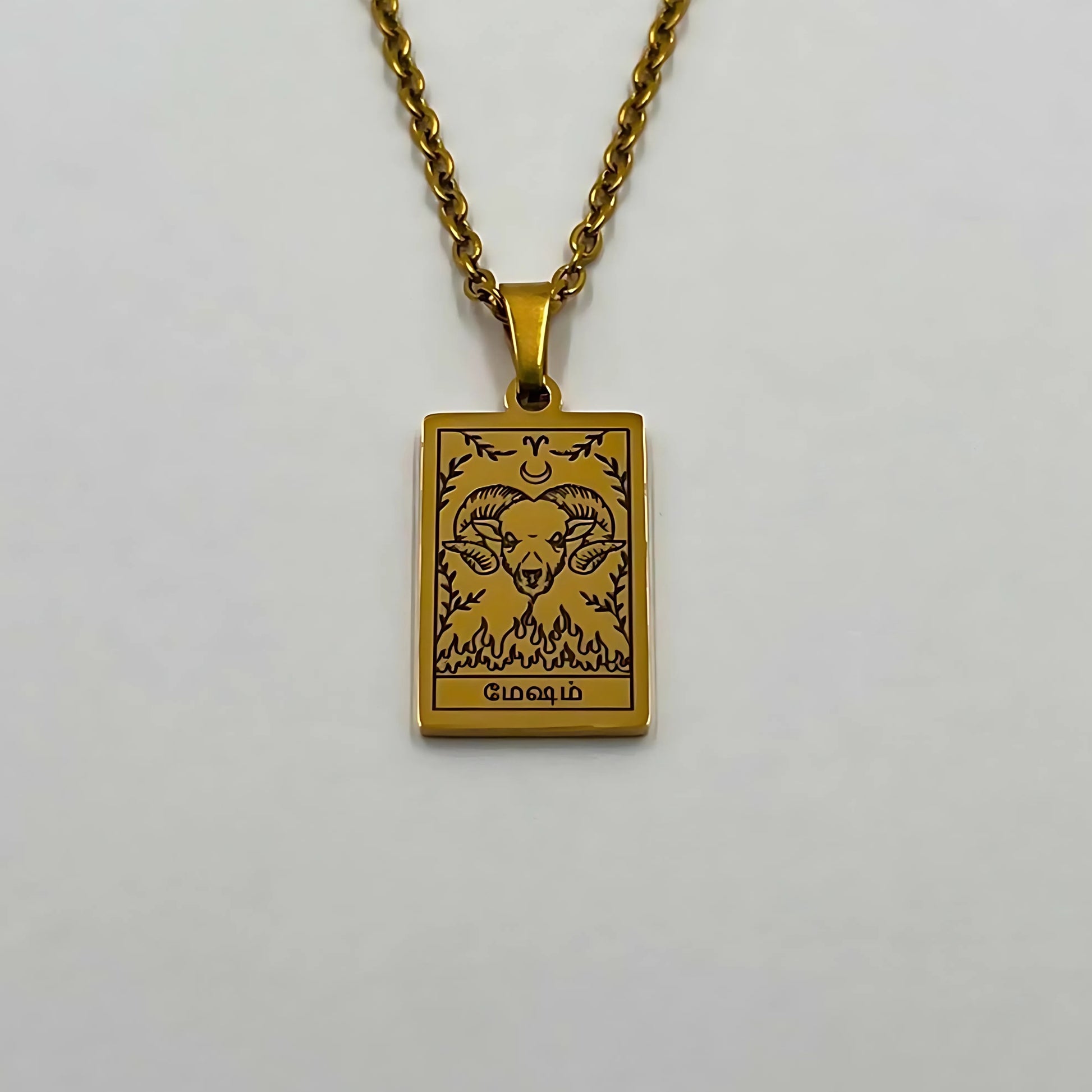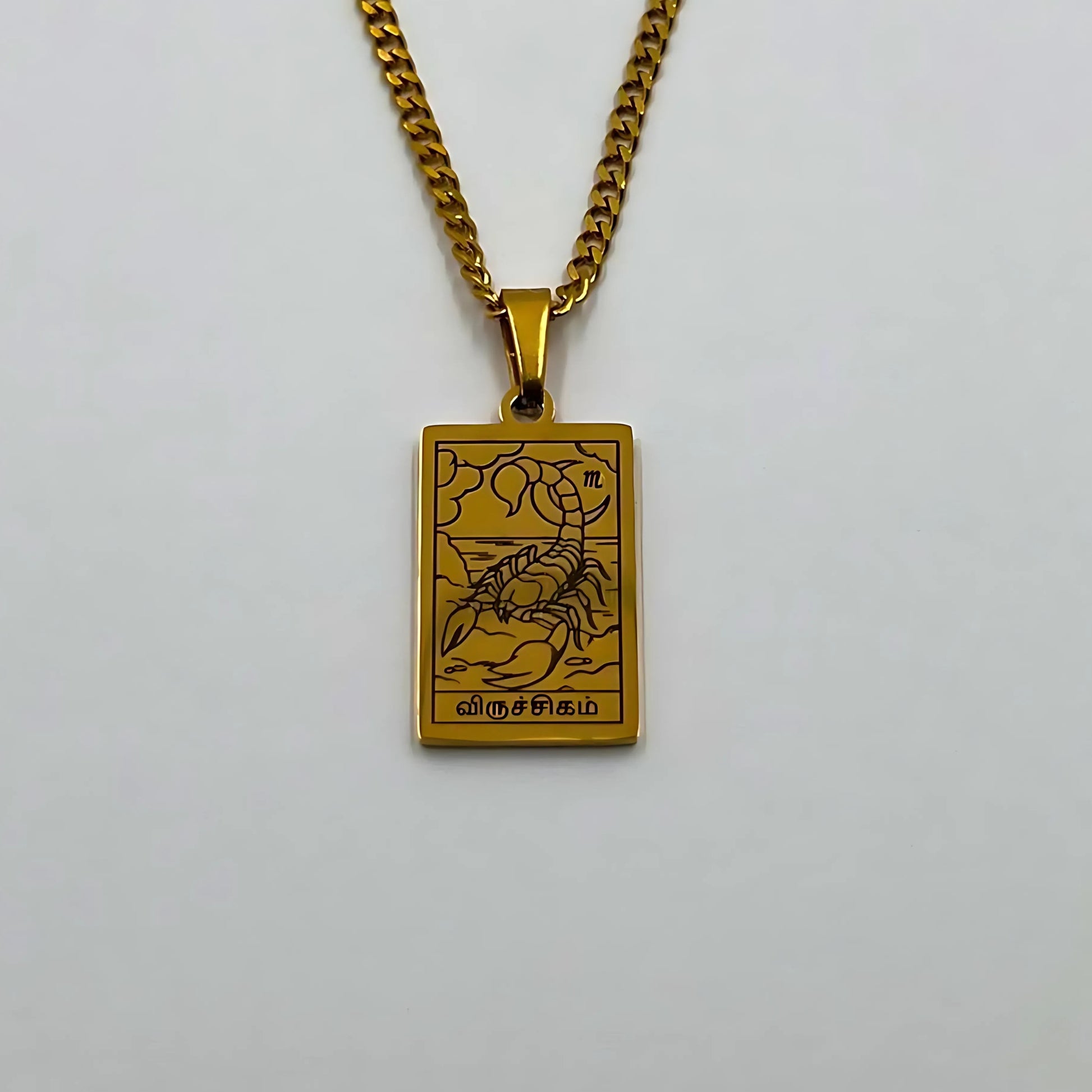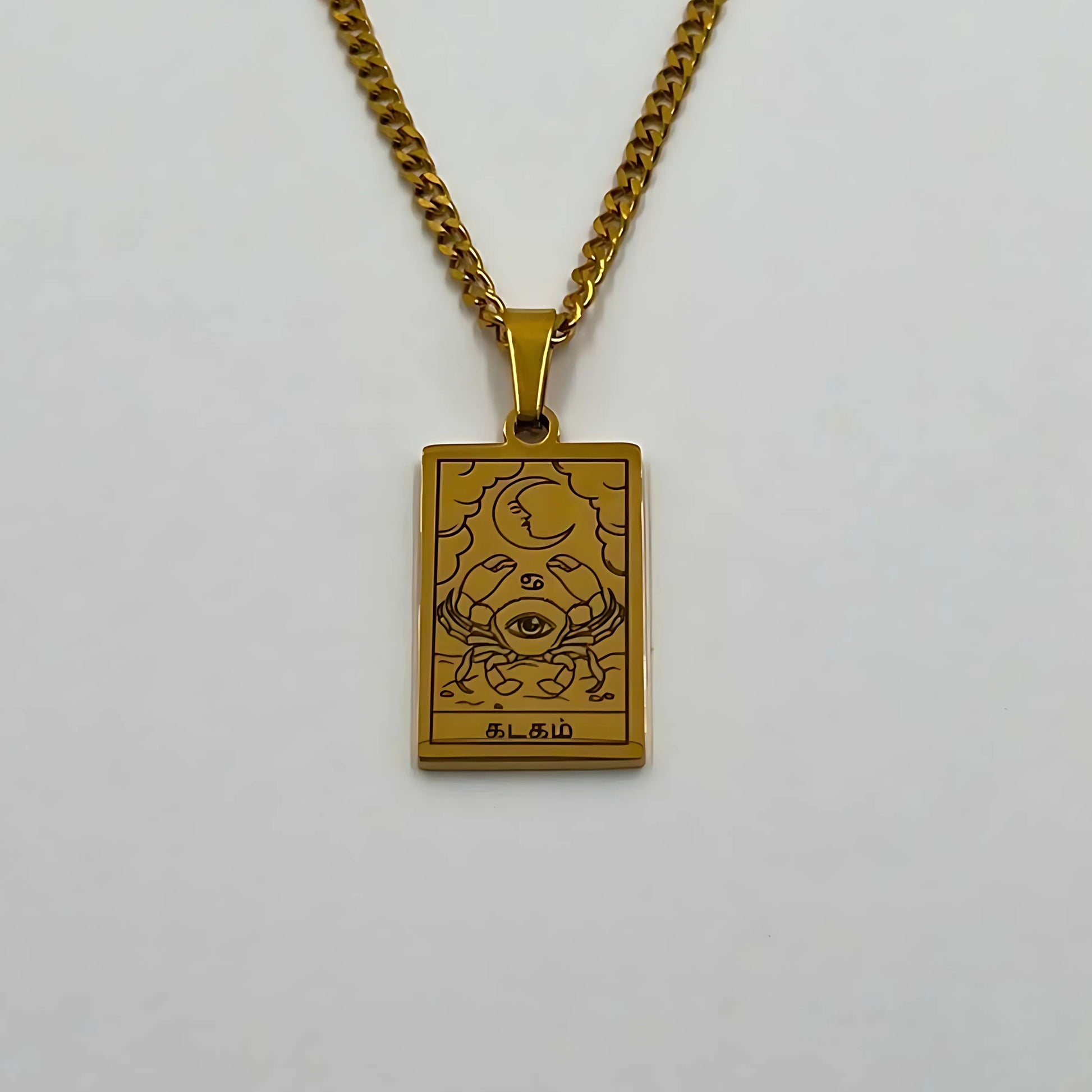 Le collier et le pendentif sont en acier inoxydable, plaqués or 18 carats et ils représentent les signes zodiaques en Tamil.