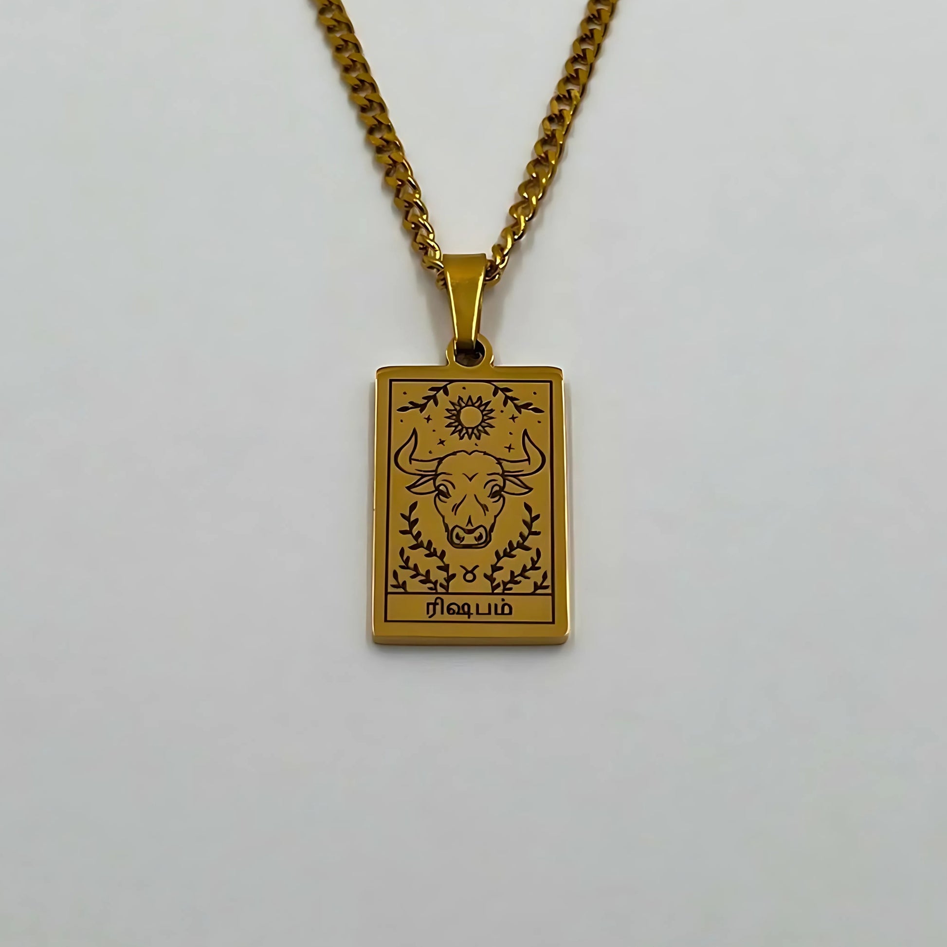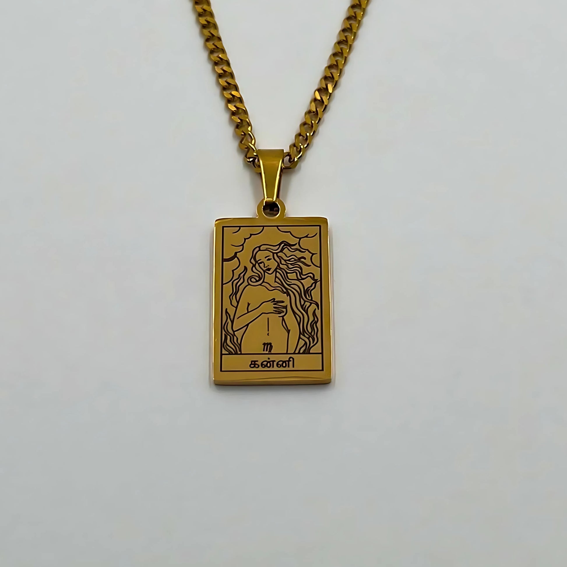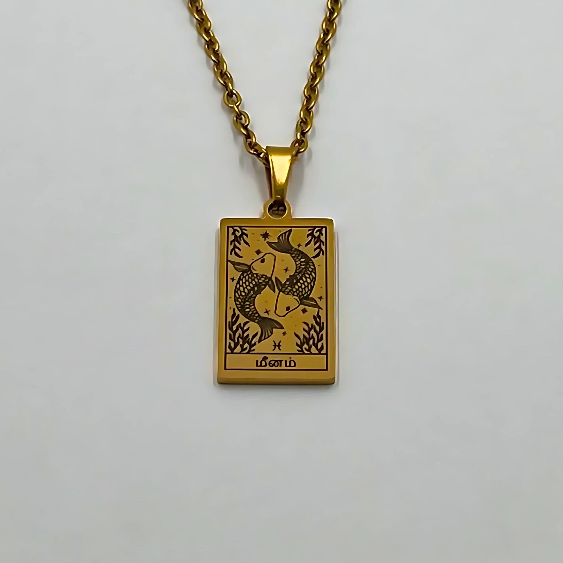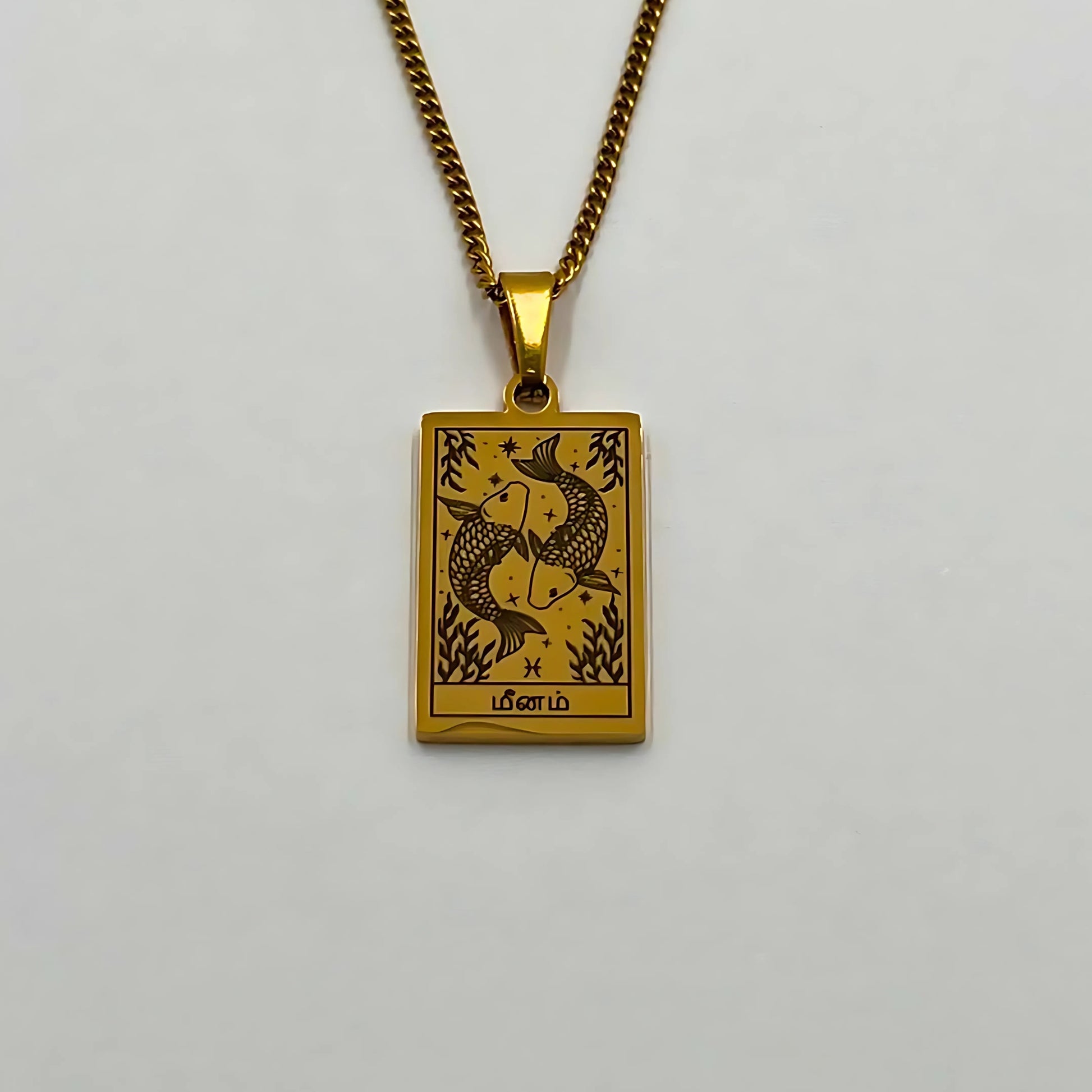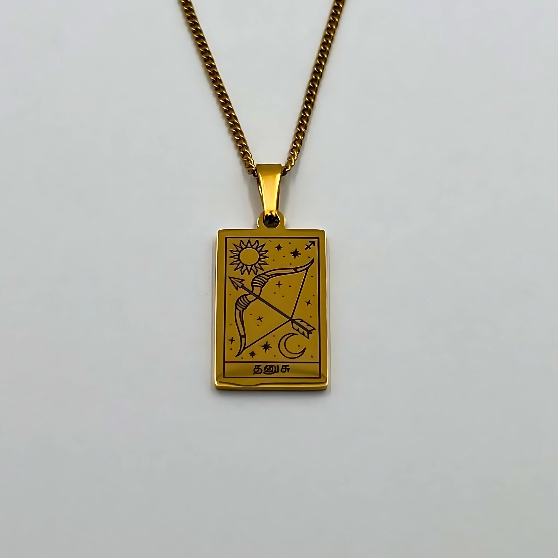 Le collier et le pendentif sont en acier inoxydable, plaqués or 18 carats et ils représentent les signes zodiaques en Tamil.